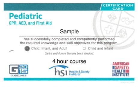 The Health and Safety Institute's (HSI) Pediatric CPR, AED & First Aid course is a CPR First Aid course intended for childcare and daycare workers who need a pediatric CPR card to meet ICCP/Idaho stars and Washington DEL programs in order to hold a daycare license. This course meets American Heart Association guidelines in all 50 states.
